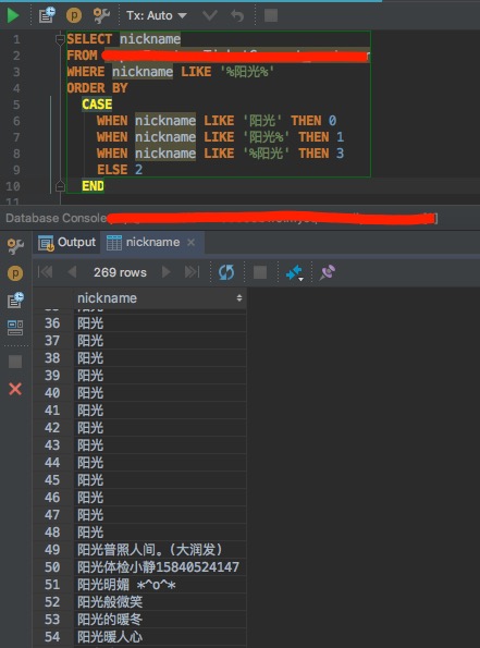 可以发现确实完整匹配 “阳光” 关键字的结果是分散的,找了一下解决方案,结果在 stackoverflow 找到这样的一个答案:MySQL order by “best match”,里面提出了几个解决方案,经过测试,在其中一个的基础上做了一些修改,得到比较好的结果。